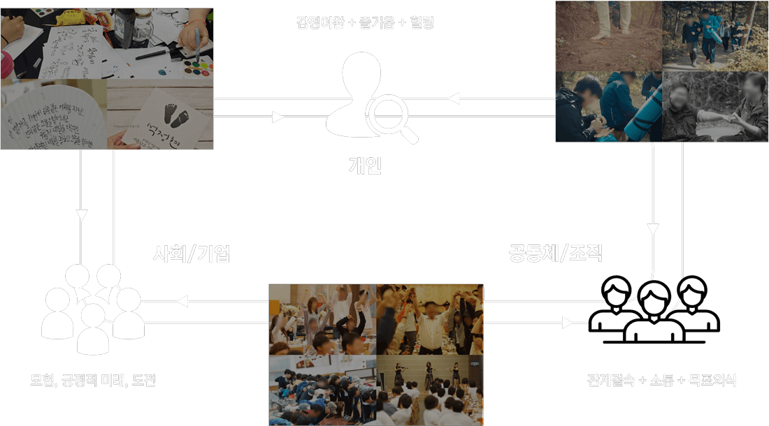 공동체적 ‘감성’과 ‘소통’으로 기업과 사람을 연결하는 특별한 경험의 맞춤형 테마 워크샵을 기획합니다.